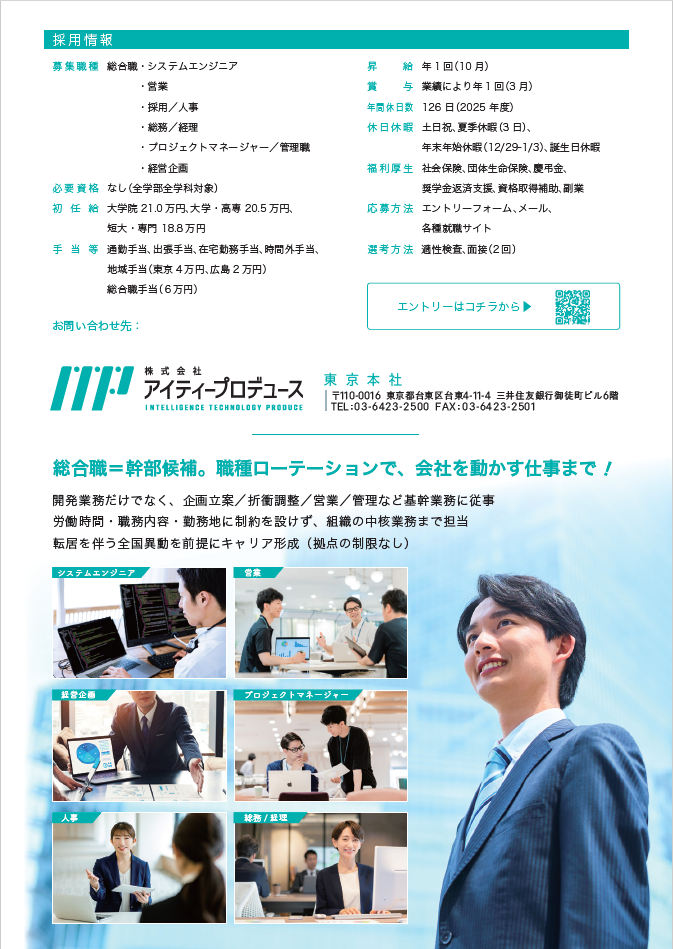 | 募集人数 | 計3名前後(東京本社/出雲支社/松江支店/江津サテライトオフィス/広島支店/大阪支店/那覇支店) |